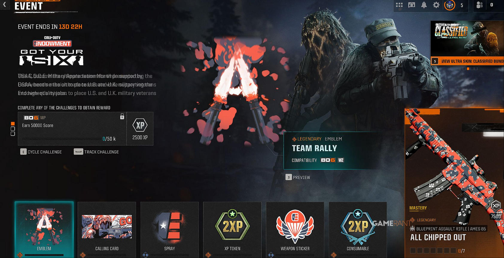 The All Chipped Out Blueprint is the Mastery Reward for the CODE: Got Your Six Event in Black Ops 6 and Warzone. To unlock it, players must earn every reward tied to the event during its limited runtime. Once all rewards have been claimed, the All Chipped Out Blueprint for the AMES 85 will be unlocked, allowing players to equip it in both Black Ops 6 and Warzone.